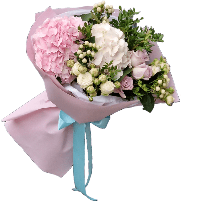 Букет з гортензіями, кущовими трояндами, гіперікумом та евкаліптом у ніжно-рожевих тонах.
