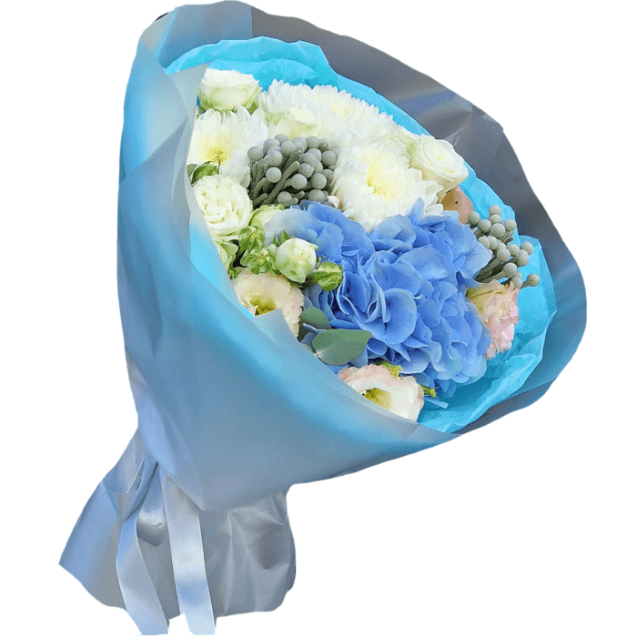 Букет з гортензією, кущовими трояндами, хризантемою, еустомою та брунією.