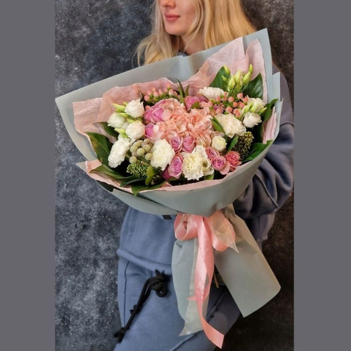 Букет з гортензією, кущовою трояндою, діантусами, еустомою, скіммією, гіперікумом, брунією та зеленню.