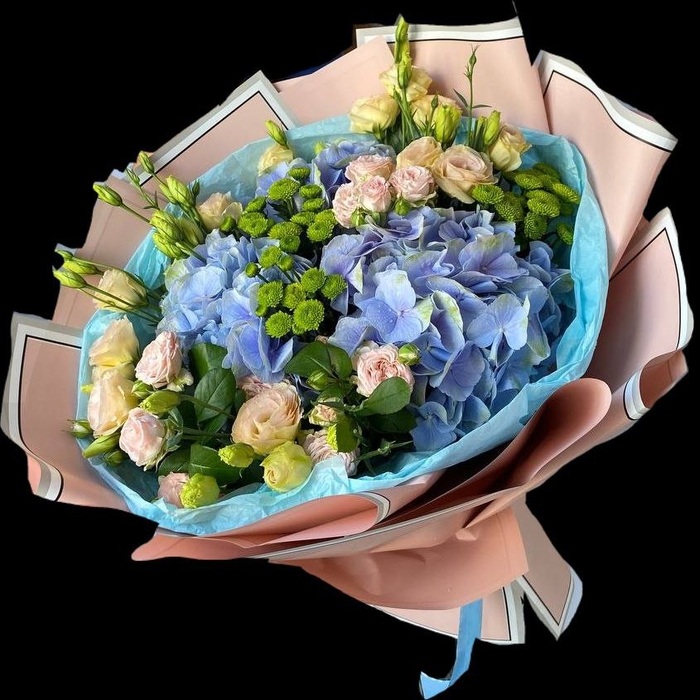 Вітальний букет з гортензією, кущовими трояндами, еустомою та зеленою хризантемою.