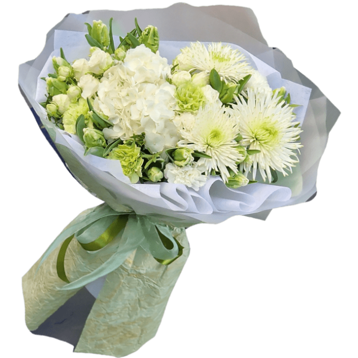 Вітальний букет з хризантемою, гортензією, тюльпанами та діантусами у біло-зелених тонах.Склад букету може бути незначно змінений в залежності від сезонності та наявності квітів. Але форма та кольорова гамма залишиться н...