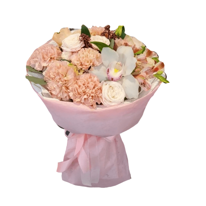 Букет з діантусами, трояндами, альстрамерією, скіммією та орхідеєю.