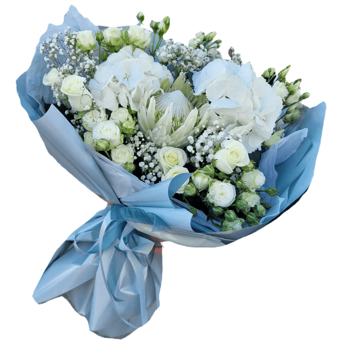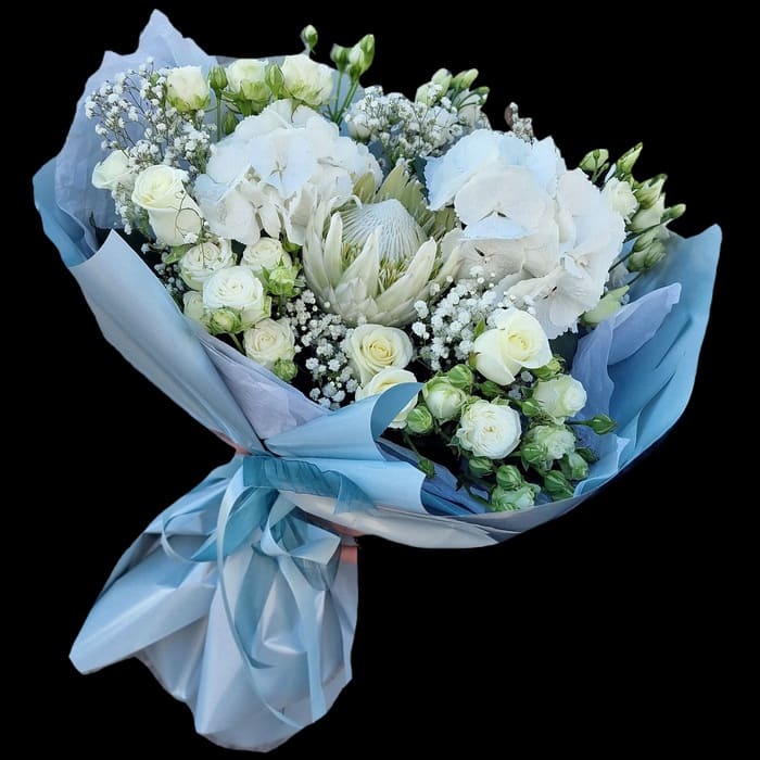 Букет з протеєю, гортензіями, кущовими трояндами та гіпсофілою у білих тонах.