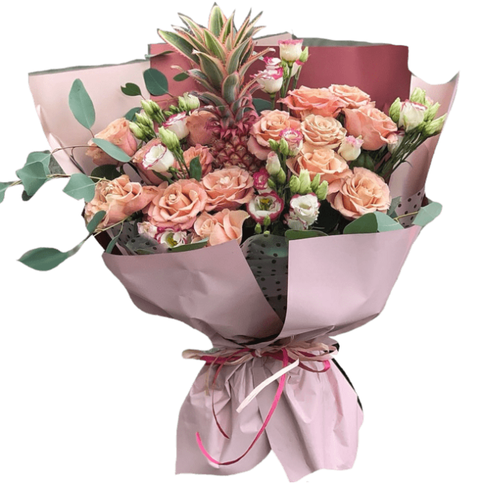 Букет з піоновидними трояндами, еустомою, евкаліптом та декоративним ананасом.