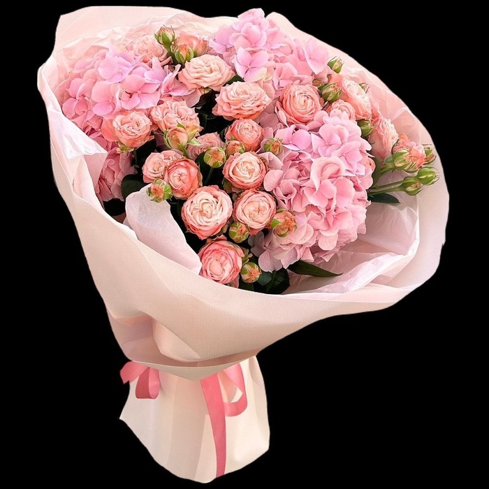 Букет з гортензіями та кущовими трояндами у рожевих тонах.Склад букету може бути незначно змінений в залежності від сезонності та наявності квітів. Але форма та кольорова гамма залишиться незмінена.Перед відправкою надси...