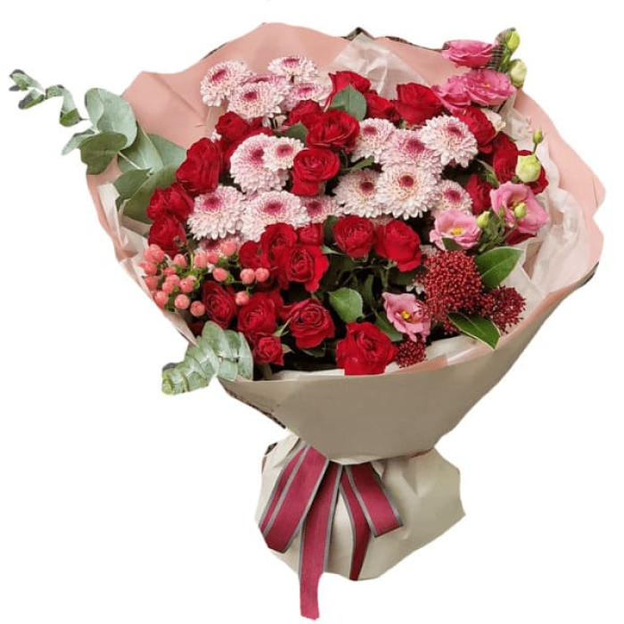 Букет з кущовими трояндами, хризантемою, еустомою, гіперікумом, скімією та евкаліптом.