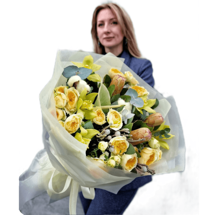 Букет з кущової троянди та протеї, з орхідеями, антуріумом, брунією, бавовною та евкаліптом.Склад букету може бути незначно змінений в залежності від сезонності та наявності квітів. Але форма та кольорова гамма залишитьс...