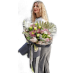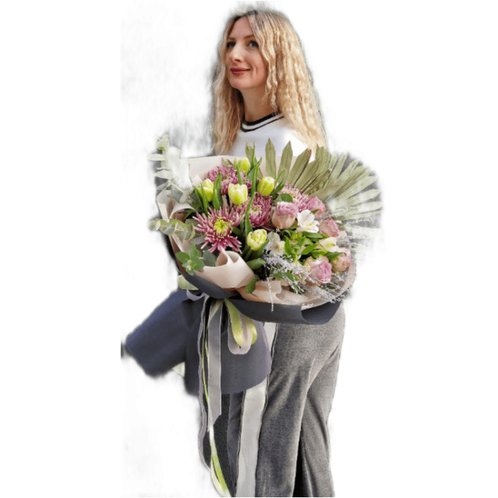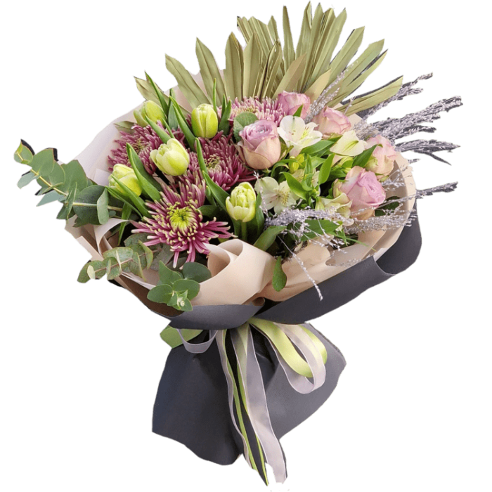 Букет з трояндами Memory Lane, альстромерією, тюльпанами, хризантемами та евкаліптом з додаванням сухоцвітів.