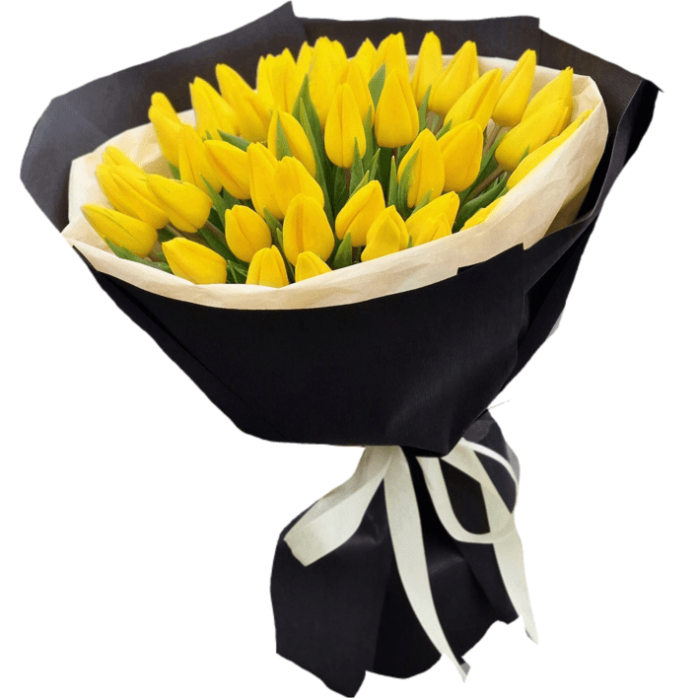 Склад: жовті тюльпани 45 шт., пакувальний папір, стрічка.